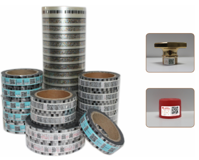 以PET膜为基材,印制出可热转印的局部纹理标识,可转印在瓶盖、瓶身这类标识防转移效果好,可以实现自动贴标。