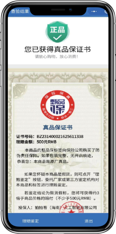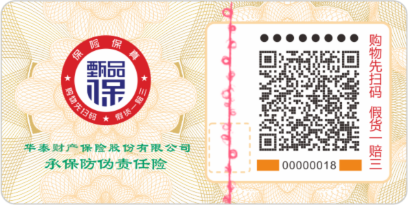 万一误购假货,消费者将获得三倍于商品售价(不少于500元人民币)的保险理赔补偿。